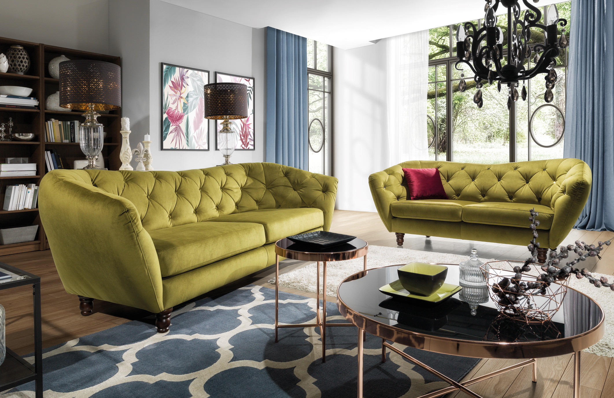 Extravagáns kanapé, amely 2 és 3 személyes kialakításban is megrendelhető. A paletta minden színében és kárpit típusában választható és egyedileg rendelhető -akár valódi bőr kárpittal is. Mélytűzött chesterfield stílusú bútorcsalád, amely elegáns, különc megjelenésével gyönyörűvé varázsol bármely enteriőrt. Az ülőfelületet hullámrugó és hideg habszivacs teszi ellenállhatatlanul kényelmessé. Választható esztergált fa, vagy krómozott fém lábakkal, de nem csak a lábak anyagát választhatja meg, a háttámla részen lévő tűzés pontokon kérhető színazonos kárpittal bevont-, vagy kristály gombokkal is. Egyedi megjelenésű, csodaszép bútor, csak Önnek egyenesen a gyárból.