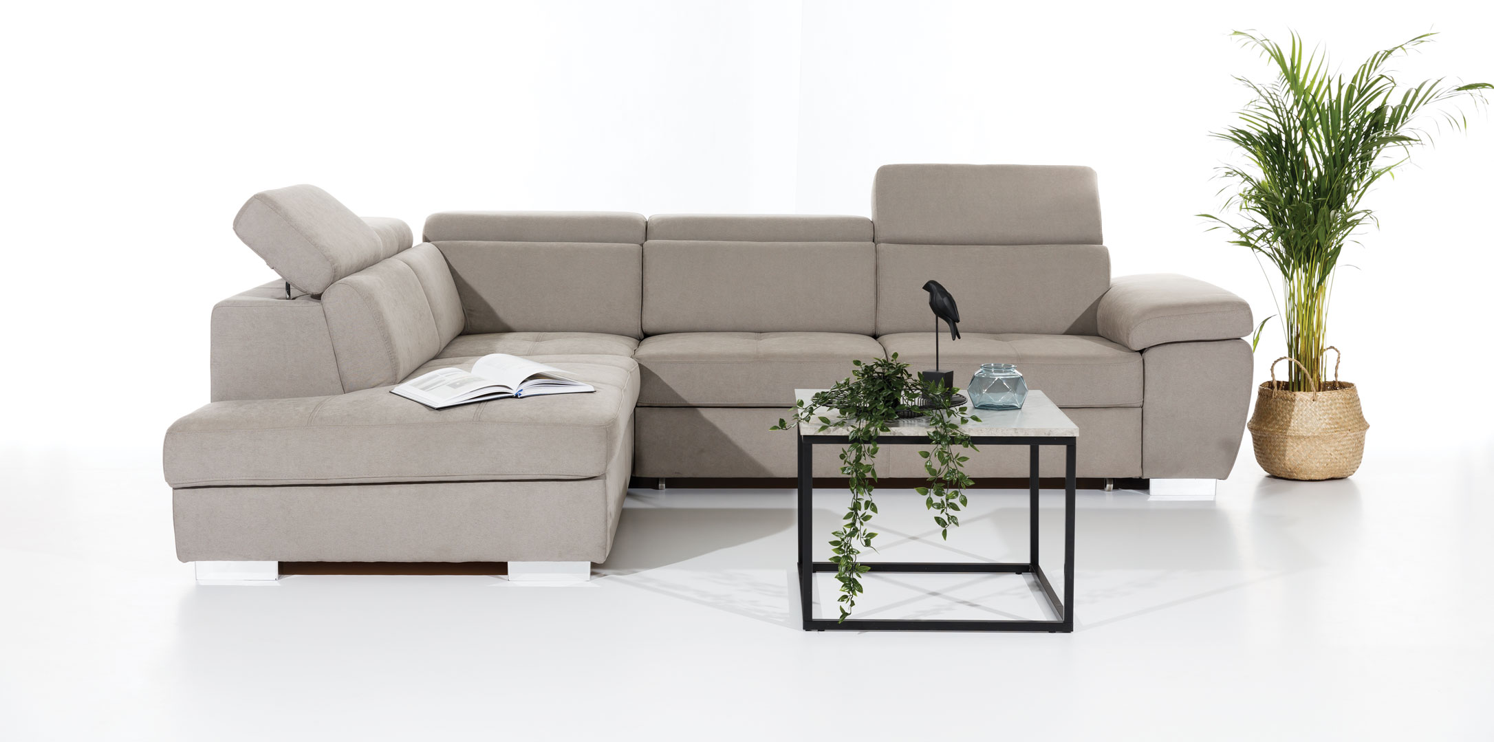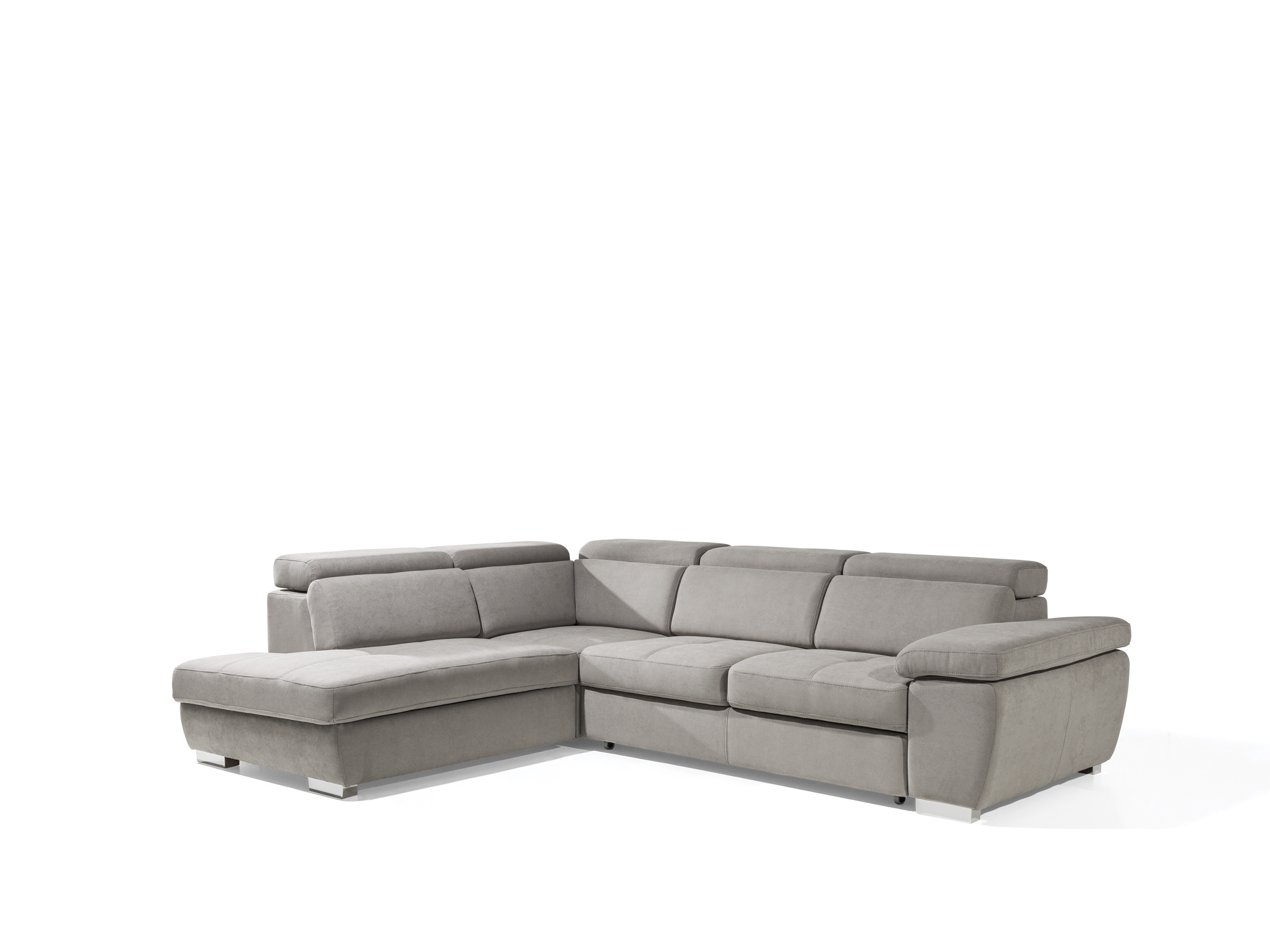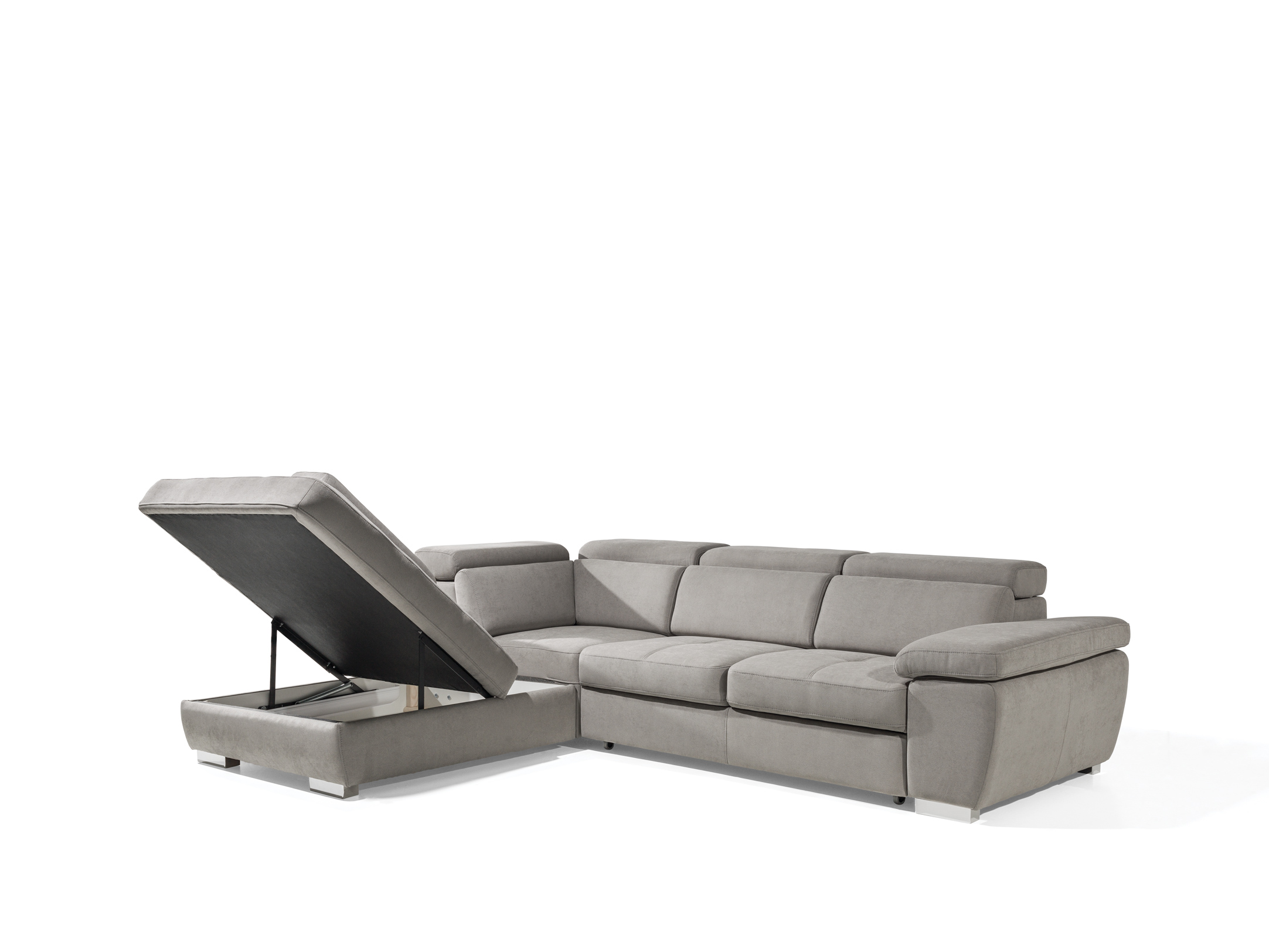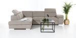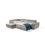 (3fb+r+os) 286 x 225 cm méretű, ágynak  nyitható, ágyneműtartós egyedi színekben és kárpitfajtákkal akár valódi bőrből is  rendelhető állítható fejtámlás, modern vonalvezetésű sarokgarnitúra.