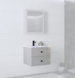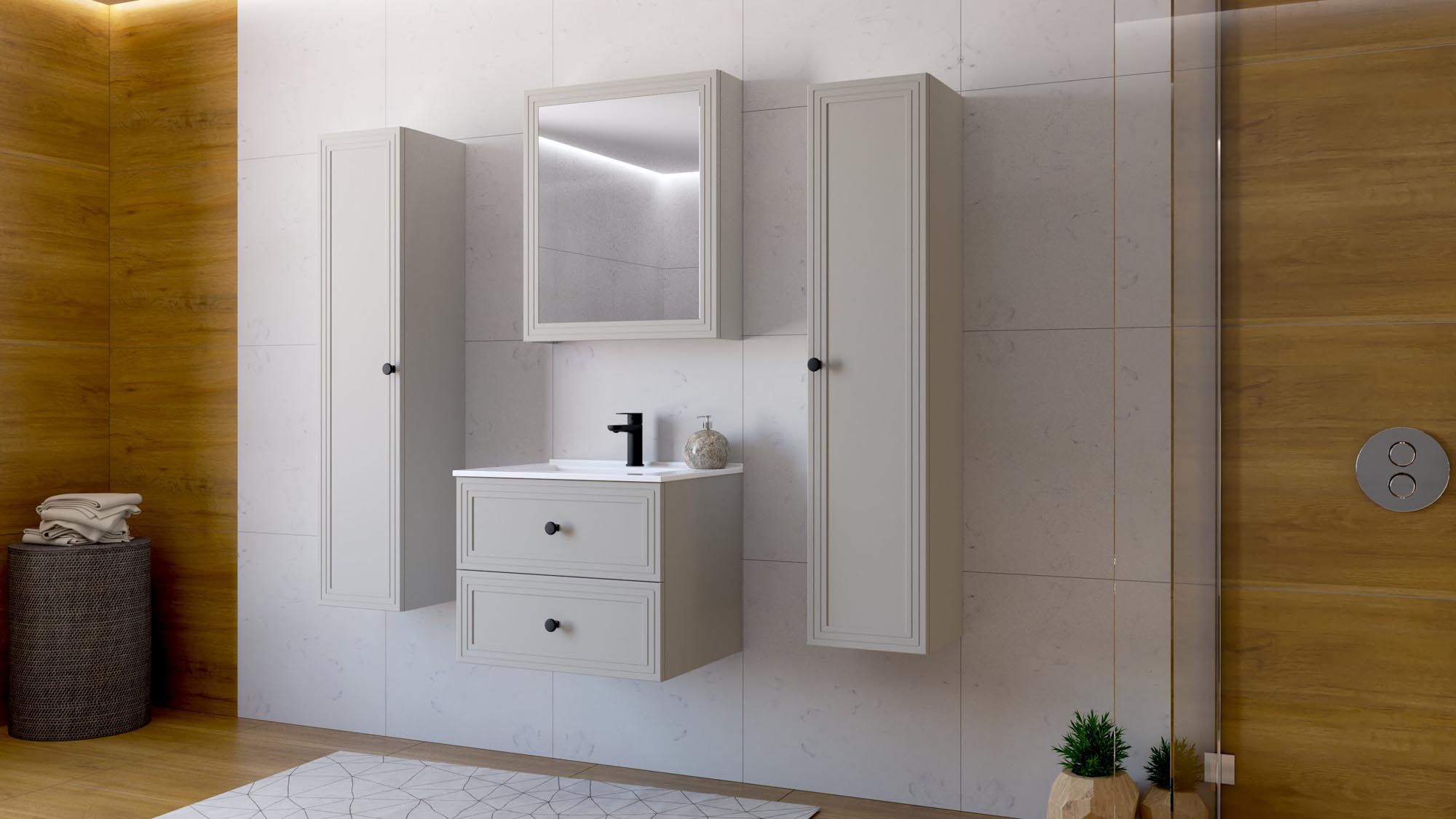 mosdó alatti szekrény, méretek: 60/45/46 cm, anyag: test – laminált faforgácslap, előlap – laminált MDF, soft close akasztók és csúszkák, szín: kasmír matt