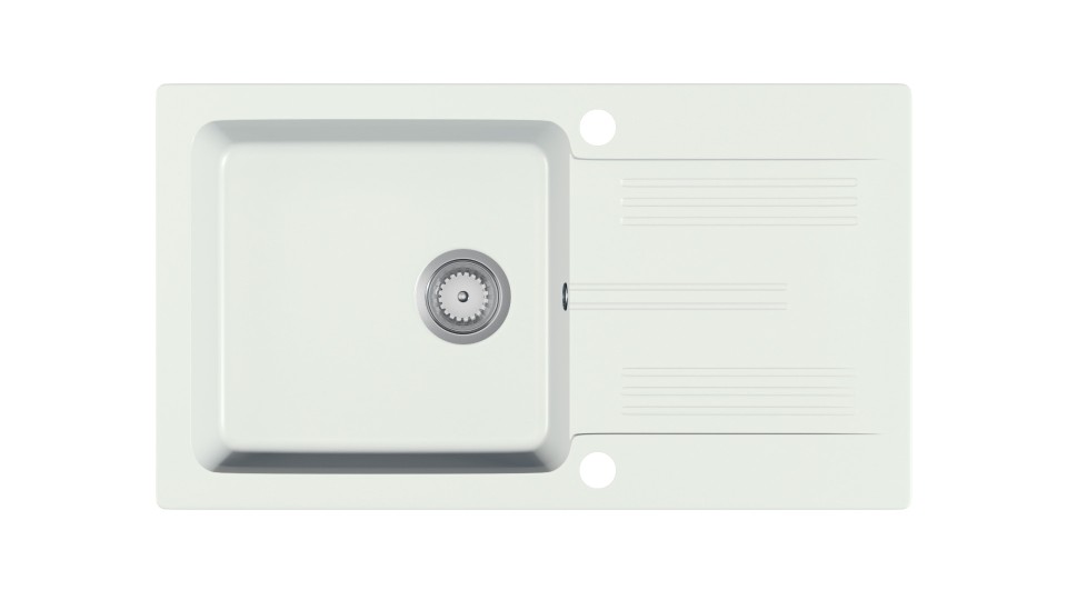 gránit mosogató, kamramélység: 16 cm, beépítés: szekrény 50 cm széles, automata szifon 3 1/2 „, mosogatógép és szemétdaráló csatlakoztatási lehetőséggel, 2 lyuk gyári szín: fehér