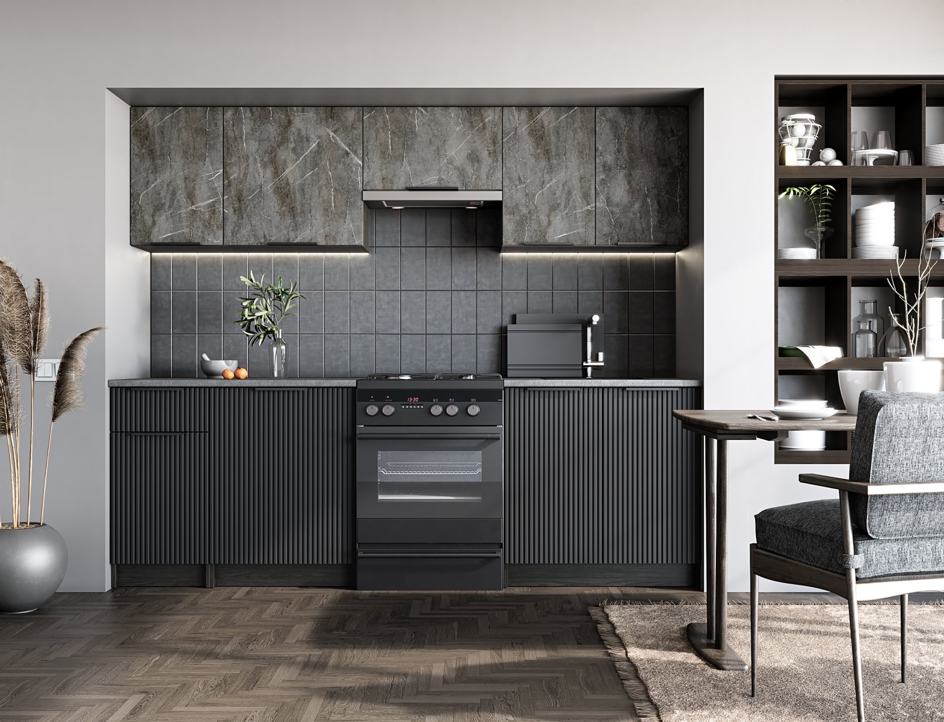 259.400Ftszett hossza: 240 cm, MDF alsó szekrény előlapok, gázemelők, munkalap vast. 28 mm, szín: előlap – szürke márvány / fekete, test – szénfa, munkalap – szürke